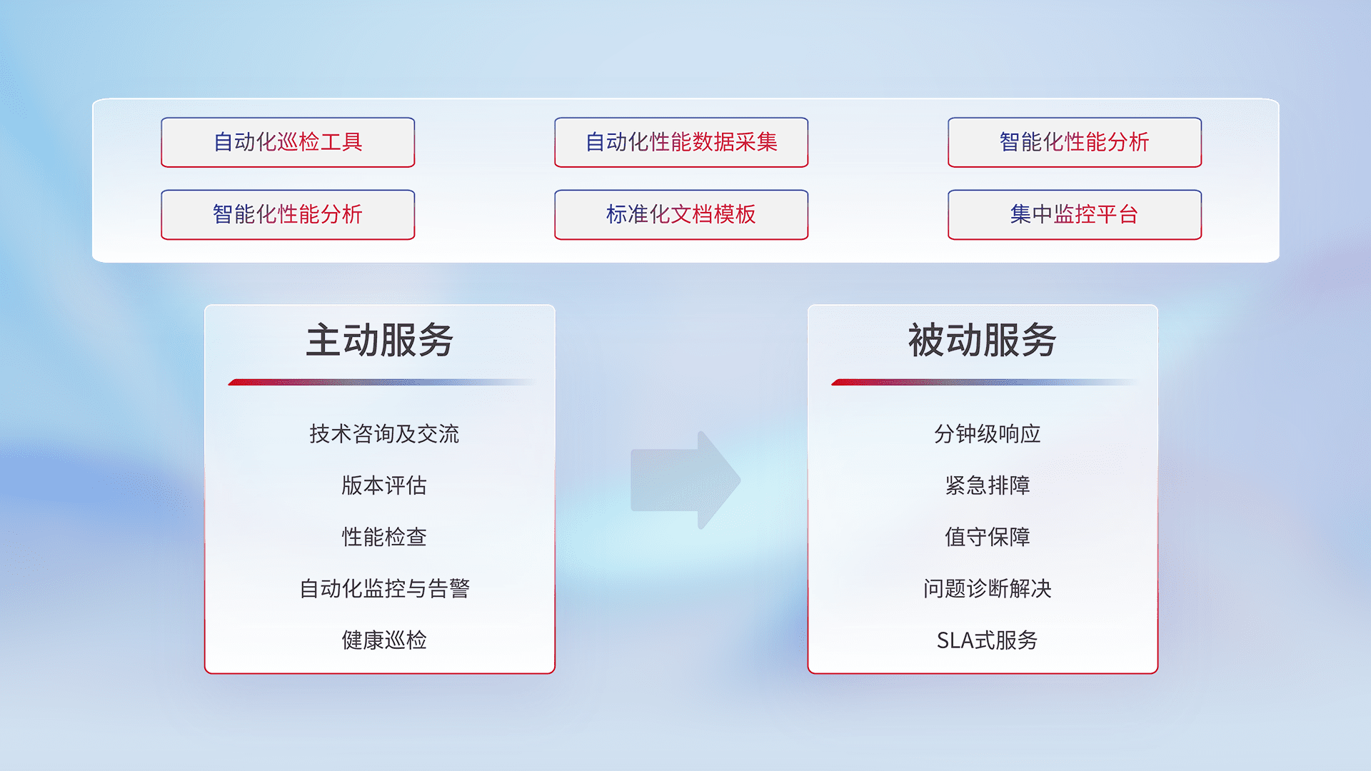 智能化工具和标准化文档,,保障服务质量,,,提供主动服务(包含技术咨询、、版本评估、、性能检查、、、、自动化监控与告警、、、健康巡检)和被动服务包含(分钟级响应、、紧急排障、、值守保障、、、问题诊断解决、、、、SLA服务)。。。。